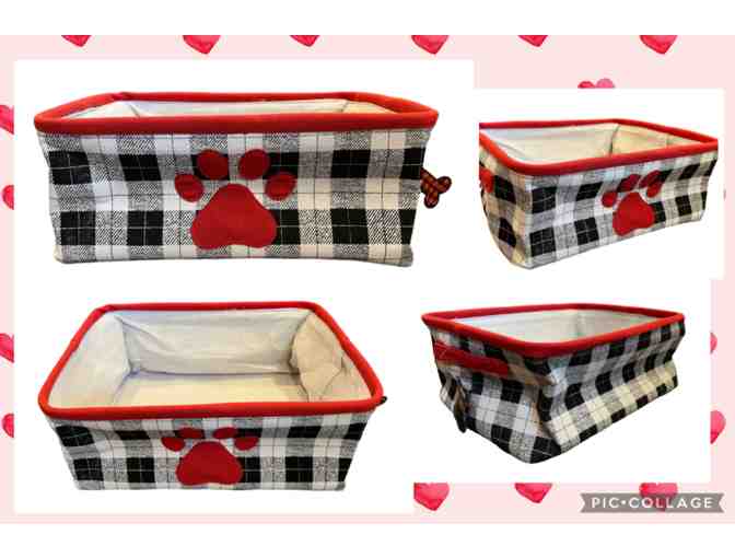 Check out this new with tags canvas storage tote! It is black plaid with a paw print on the front. It can collapse for storage. Great for dog toys or perfect at the bottom of the stairs to fill with stuff that needs to go upstairs. It has sturdy canvas handles on the ends.