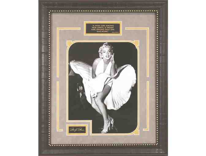 Beautiful presentation piece of iconic Marilyn Monroe with famous quote, "A wise girl knows her limits. A smart girl knows that she has none." Includes fascinilie autograph. Professionally framed. Size is 19" by 23".