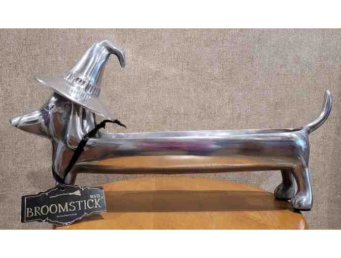 This silver metal candy or cracker holder is dressed up for the Halloween season. It is 19 inches long x 9 inches tall. This is a much sought after item every year!!!