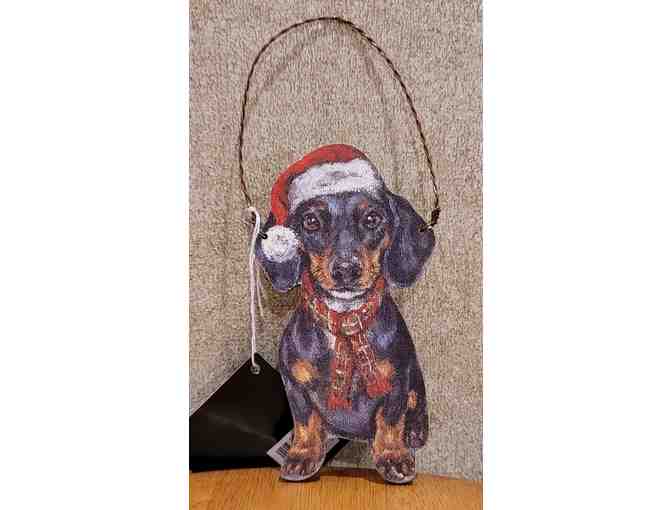 This dachshund is a wooden flat ornament that is 4.75 inches tall x 2.5 inches wide.