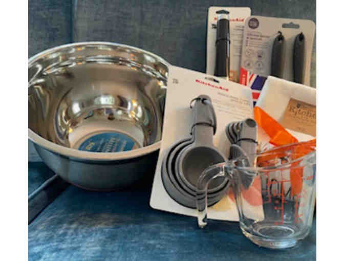 The cookie baking basket includes: large mixing bowl, 2 cup measure, spatula, spoon, small spatula set, measuring cup & spoon set, and 2 kitchen towels.