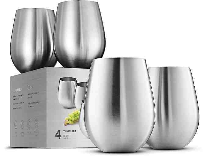 Four (4) new shatter proof stainless steel stemless wine tumblers. Made of 18/8 food grade stainless steel. Holds up to 18 oz! Yikes!! :-)
