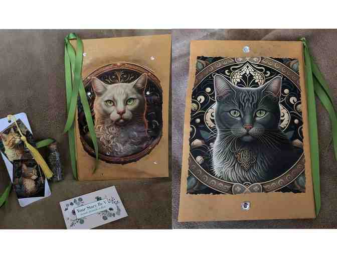 This is a beautifully handcrafted journal set. The journal contains 22 pages of blank paper ready to be filled with your special memories or photographs. Measures 9.5 x 6.5 inches and features two pockets in the front and back that have many hidden treasures in them. Meticulously detailed. Included is a lovely coordinating book mark and a four inch long jar of fresh catnip from the garden of the creator. Check out the many other wonderful journals that this talented Delaware, Ohio artist has displayed on her Facebook page at: Your Story by V. She recently won an award at a craft show for best fiber artwork.