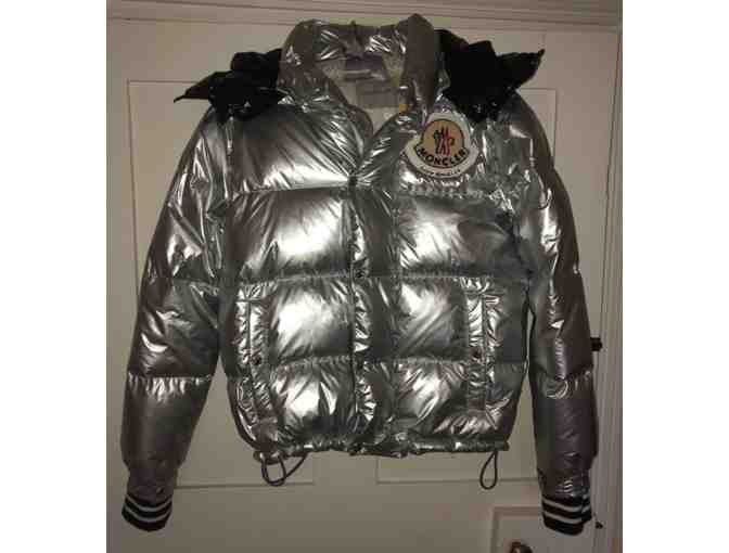 A limited edition silver and black goose down ski jacket from the 8 Moncler Palm Angels collection.