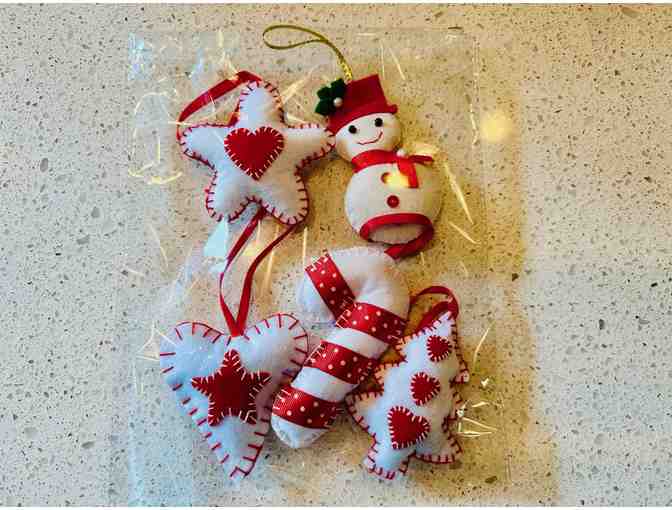 Handcrafted set of 5 red and white holiday plush felt ornaments for your Christmas tree decorations or a nice gift for your friends, family, co-workers