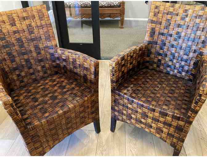 Two well-made, comfortable rattan armchairs in good condition. Orange or purple pads are included, color based on availability. These are great indoors, or perhaps outdoors on the patio.