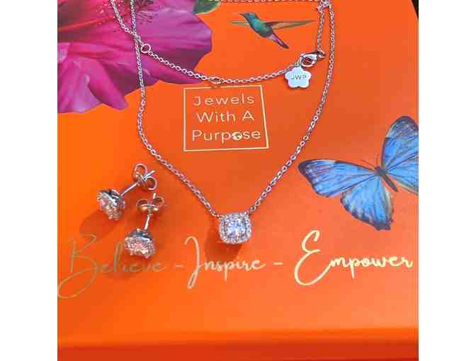 Add glamor to your day with these exquisite jewels! Beautifully designed in California and finely crafted in solid 925 sterling silver with gold overlay and the world’s most desirable simulated diamonds ever created! Hypoallergenic. The necklace measures 18 inches, with adjustable length. Lobster clasp. A signature camellia flower detail in the back complements this lovely piece. A beautiful array or clear zirconia adorn the post earrings and the stunning pendant. Outstanding packaging for gifting or to hold your keepsakes! Created exclusively for the philanthropic community. Our jewelry goes through a special process, starting with high polish, followed by a coating of palladium, then platinum and finished off with a layer of rhodium or yellow gold. With A Purpose is known for: timeless elegant design, luxurious and everlasting quality.