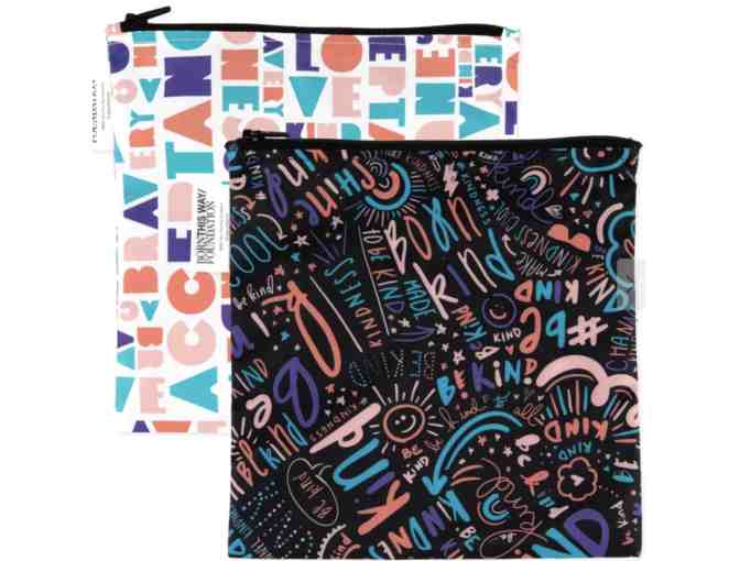 A gift basket containing 3 SuperBibs; a silicone grip dish; a splat mat; 2 small snack bags; 2 large snack bags; three clear travel bags, and a wet bag.