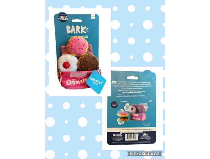 Adorable dog toy of 3 donuts approx. 2.5" in diameter and a small donut box. The donuts have squeekers and the box has crazy crinkly.
