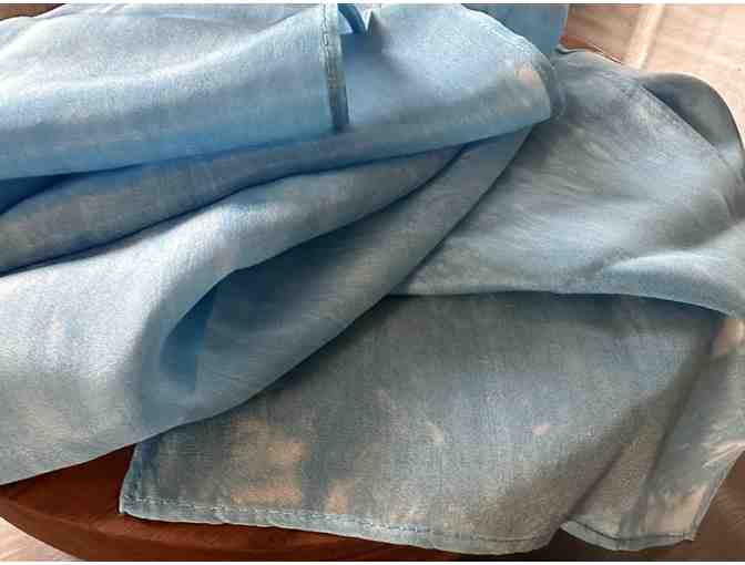 This 100% hand-dyed silk scarf was generously contributed by Mary Ann Wamhoff of the Veriditas Counsil. Approximate dimensions are 8 inches by 70 inches and it's a lovely light blue/aqua color with white. It was purchased at the Crozet Arisan Depot in Crozet, VA where our donor resides. It was hand-made at Gillsies Handcrafted Scarves in Palmyra, VA.