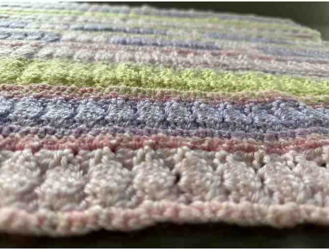 This Baby Afghan was generously donated to our auction by Pat Richards. The beautiful patterns are created in pastel pink, yellow, and lavender with hints of green and white. Hand-crocheted with love, using soft baby yarn. Machine Washable and Druable. Details of the material used and care instructions included.