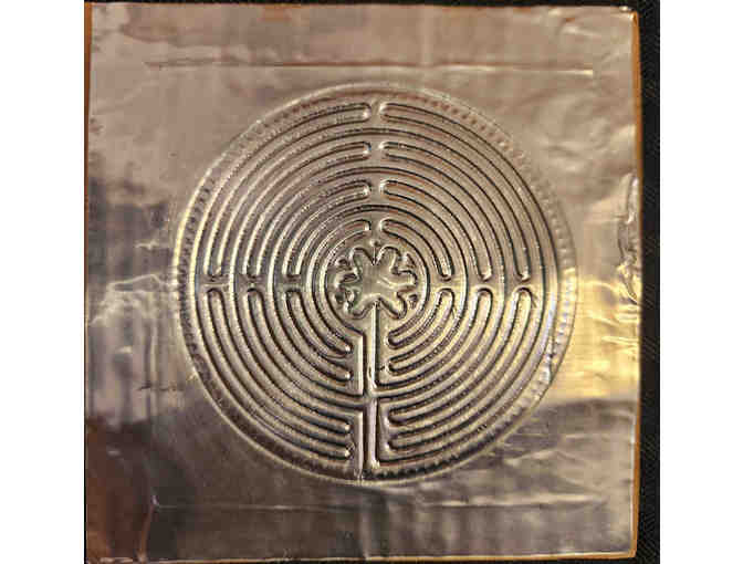 5-inch silver foil impression of Chartres Labyrinth mounted on cardboard. Handmade.