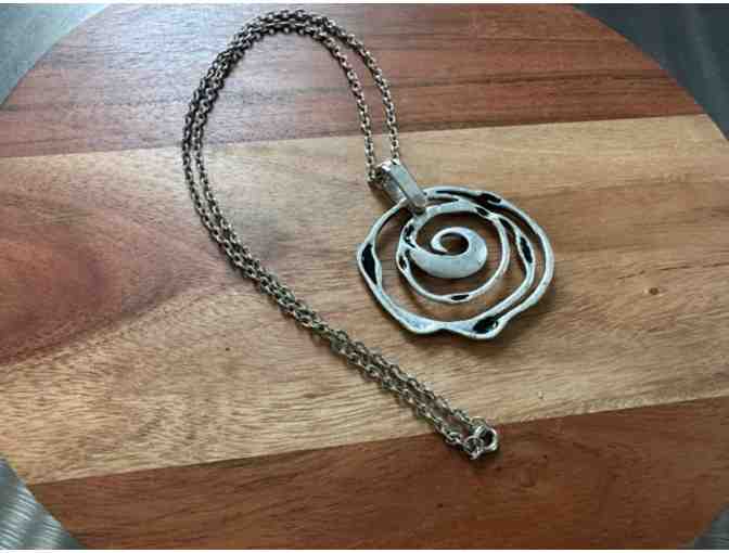 This necklace was donated to our auction by Jane Wirth. It is a circular pendant necklace in a spiral pattern. Approximate dimensions: Pendant is 2.25 inches wide, 2 inches high and the chain is 24 inches long.