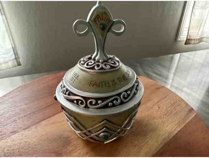 Prayer holder. Approximately 4 inches tall, 3 inches wide. Ceramic with metal and stone adornments. Donated to our 2023 auction by Jane Wirth.