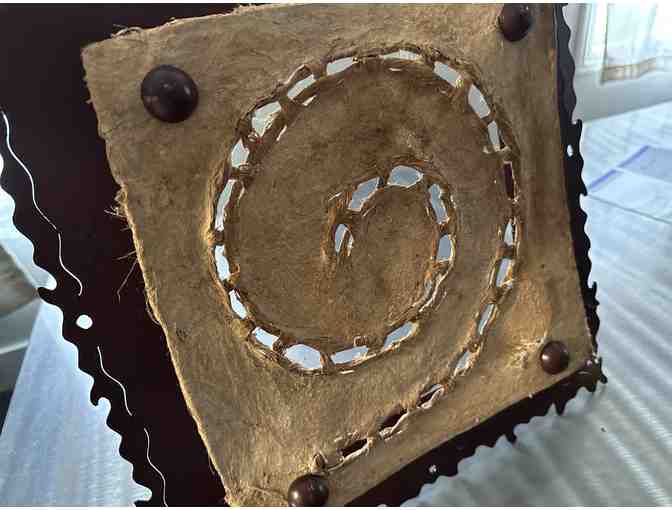 This unique artwork was donated to our 2023 auction by Jane Wirth. From the donor: Labyrinth Wall Hanging. Handmade in Mexico. Made of hand tooled leather and metal that was hand cut. Measure approximately 16.5 inches by 16.5 inches overall, leather 11.5 inches by 11.5 inches. Stands away from wall 4 inches. Light can be placed behind (not included).