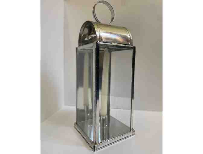 Table lantern with glass made by Old Sturbridge Village craftsmen. 15.5" height including handle, 5.25" wide, 5.25" deep.