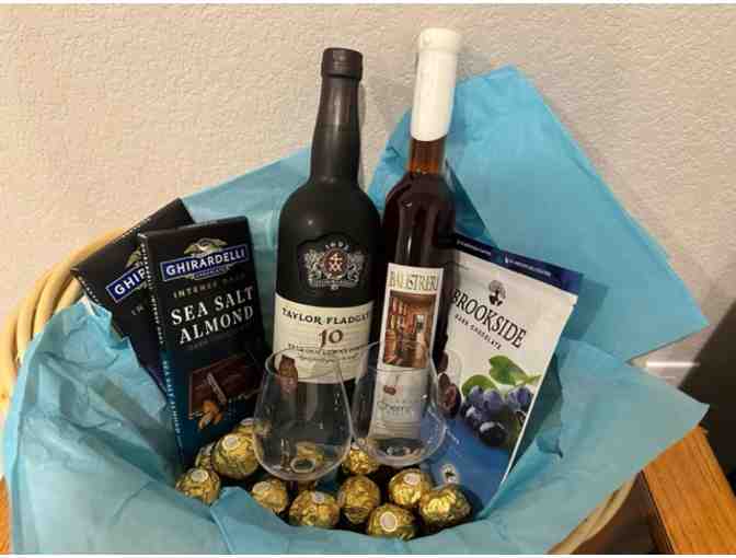 This gift basket include an assortment of Ghirardelli and Brookside chocolates accompanies by a bottle of Taylor Fladgate 10 year Tawny Port and a bottle of Balestreri Cherry Wine PLUS a $52 Gift Certificate from Season's 52.