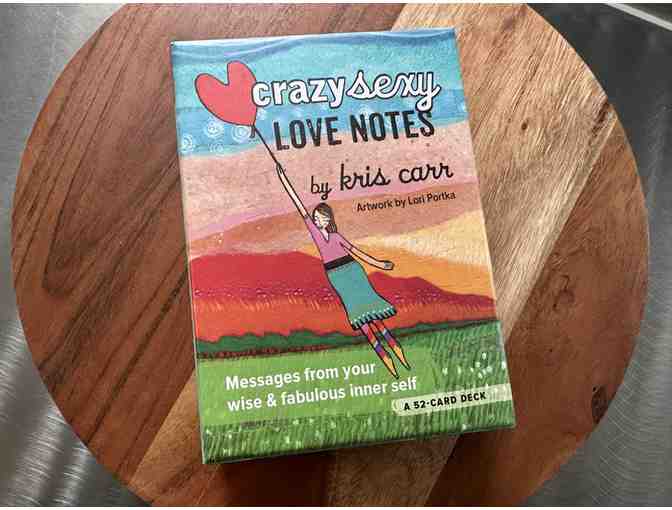 This donation arrives to our 2023 auction by Ellen Sheaffer. Crazy Sexy Love Notes is a card desk by Kris Carr, with artwork by Lori Portka. It's vibrant and beautiful artwork are stunning.