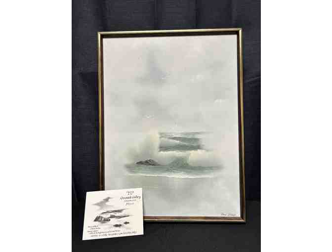 Stunning ocean painting of crashing waves signed by renowned Californian artist Doris Gilbert (active in the mid-20th century). This oil painting beautifully portrays the breaking waves on rocks of a beach as viewed through the cloud break. It was part of her portraits of the ocean series.