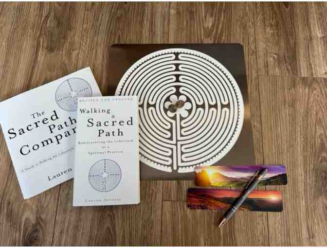 We consider this package worthy of a gold medal! It contains two very special books to Veriditas - authored by Veriditas Founder, Lauren Artress (Walking a Sacred Path, and Walking a Sacred Path Companion). To top off this package, we have a beautiful metallic sheen finger labyrinth (which was a limited edition color in the Veriditas store this summer), a stunning pair of Chartres labyrinth earrings, two Veridtas bookmarks and a rose-gold accented Veriditas pen!