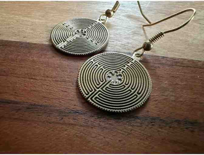 Thin, light, and incredibly detailed...These beautiful Chartres Labyrinth dangle earrings are dainty, detailed and darling. Donated to our Auction efforts by John Ridder. Antique-Gold Hue.