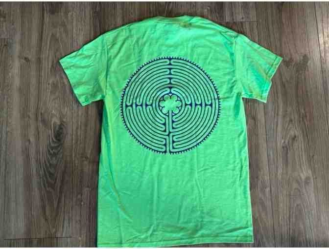 Donated to our auction by John Ridder. This S 50% cotton, 50% polyester t-shirt is bright green with a large blue labyrinth on the reverse. On the front is a small half labyrinth and "paxworks"... a comfortable way to share your love of the labyrinth!
