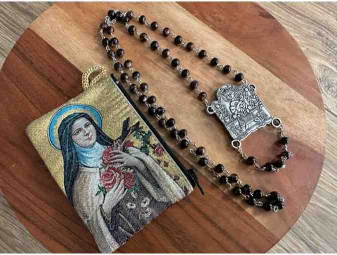 This auction donation comes from Catherine Anderson and directly from Chartres. It is a Pilgrim Medallion Necklace made with a rosary from Chartres Cathedral in Our Lady Bag.