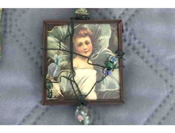 This lovely necklace with a two sided pendant measures 17" long. The ribbon is 15" long, and the pendant is 2"x2". Two different pendants on one necklace!