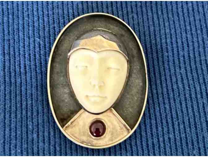 This pin/pendant is sterling silver, with a woman in white and a small amethyst below her. It is 1.75"x 1.5". Delicate and beautiful!