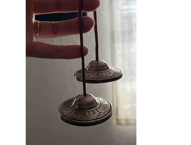 These exceptional hand-cast prayer chimes are made by Tibetan metalcraft artisans in India. Each chime is individually handcast using an ancient sand-casting method, then hand-tuned in finishing. Their song is strong and true. Strung with a handsome waxed cotton cord. Excellent for use in meditation, teaching settings, musical applications or as an attractive table top decoration.