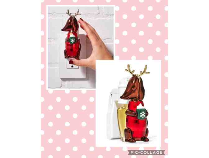 Sit, stay, smell! This dapper Dachshund Wallflower plug adds a unique twist to any holiday décor. He's enjoying hot coco in his best reindeer attire. Buy your choice of Fragrance Refill as it isn't included in your winning bid. Note: This wallflower is no longer available at Bath and Body works.