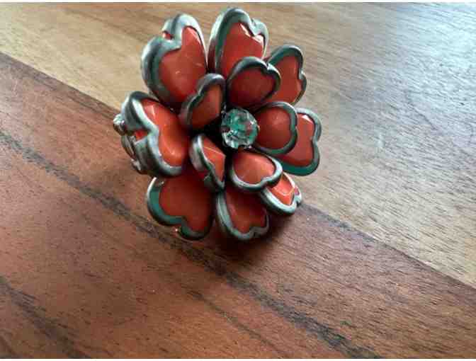 What a fun fashion ring.  Each petal is in the shape of a heart, and a fun stone adorns the ceneter.  It's an elastic band, for comfortable wear on a wide spectrum of finger sizes!