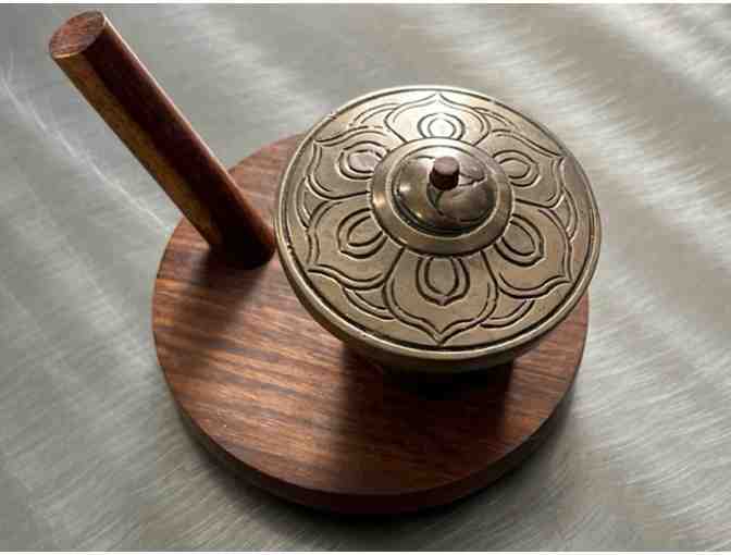 This charming table chime is made by Tibetan and Indian metalcraft artisans in India. The chime is individually handcast, hand-tuned, embellished with a lotus pattern and sits above an attractive hardwood base. Excellent for use in meditation, teaching settings or as an attractive table top decoration. As the vibration of the chime begins, our awareness comes into focus. Assembles easily.