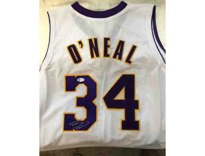 Los Angelas Lakers Jersey autographed by Shaquille O'Neal. Number 34 LA Lakers Jersey - White with maroon/gold numbers. Autographed on back of jersey.