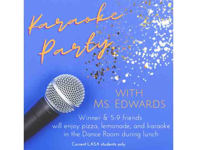 The space will transform into a party space with all the fun lights, microphone, and monitor to display any tunes you'd like to sing and dance to. Winner supplies list of songs in advance to Ms. Edwards and she will set up the rest to plug and play while you dance and sing your lunchtime away. Pizza, lemonade will be provided. Winner plus 5-10 friends!