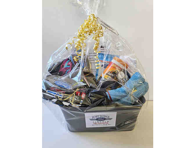 This auto basket from Fort Dodge Ford, Lincoln, Toyota includes a certificate for a complete interior auto detail valued at $175.95, plus an Oil Change Service valued at $68.92 and a Platinum Car Wash! It is also filled with goodies like Ja-Mar Cruise In Shirts, Fort Shirts, auto cleaning supplies and auto freshner.