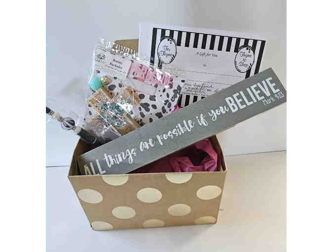 The holidays are coming and this basket makes such a thoughtful gift! It includes 1 lunch a month at Tea Thyme, a freshie and pen from Luki Co and a neat sign reading "All things are possible if you believe."