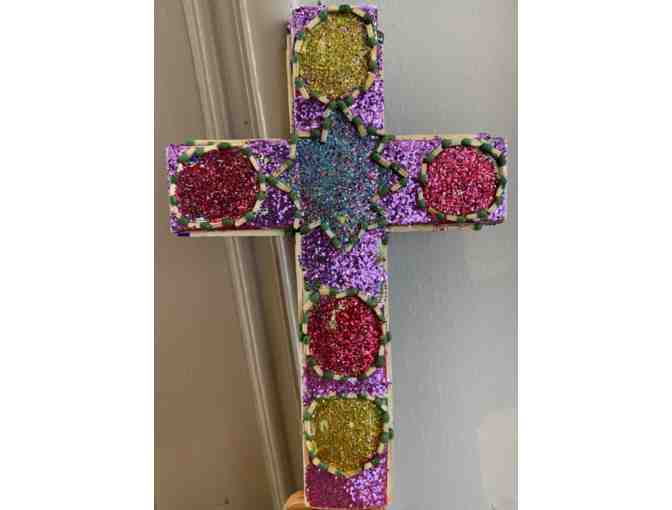Glitter Cross by L.W. Crawford. Matchsticks, glitter, and cardboard backing. 8.5" x 6".