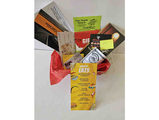 Forget about cooking with all of these great options! This basket includes a $40 gift card to Ninja Sushi Steak House, $25 certificate to Rides Bar & Grill, $25 to Mineral City Mill & Grill, $25 to Tom Thumb Drive In, $30 to Lomita's Mexican Restaurant and $20 Peking Garden.