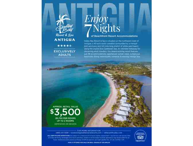 Galley Bay Resort & Spa, a 40-acre exotic paradise surrounded by a tranquil bird sanctuary and 3/4-mile-long stretch of white sand beach along the crystal blue Caribbean Sea. An intimate hideaway for discerning adult travelers, this award winning resort features just 98 accommodations spectacular sunset views, sumptuous beachside dining, watersport, romance, & relaxing Indulge Spa. This Resort Certificate provides 7 nights accommodation for up to two rooms (double occupancy) (valued up to $3,500 depending on dates of travel). All reservations are subject to mandatory supplement of $260 per person, per night that provides dining, beverages, resort facilities, activities, service charges, & gratuities. Guests choosing to upgrade to higher category may do so for $75 per room, per night. Resort black-out dates do not apply however, additional peak season surcharge of $75 per person, per night applies for stays during Dec. 21Jan. 3 & Feb. 1-24. Air transportation is not included. Air transportation must be purchased prior to final confirmation of stays Dec. 21-Jan. 3 & Feb. 1-24. Reservations are subject to availability, some restrictions apply. Nightly rates are subject to change and the resort's normal cancellation policies. Details: Valid for up to 2 rooms, double occupancy Winner responsible for airfare & All-Inclusive supplement of $260 + tax and service per person, per night.