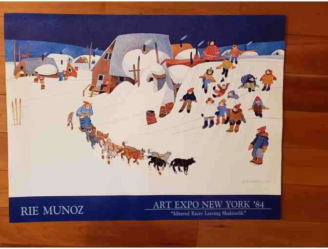 18" x 24" poster dog team by Alaskan artist Rie Munoz. "Iditarod Race leaving Shatoolik" Art Expo New York 1984
