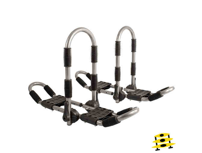 Need to accommodate two kayaks? This double kayak rack for cars adjusts to fit a variety of kayaks. Quickly folds flat when not in use for improved aerodynamics, roof clearance, and storage. Heavy duty, powder-coated, no rust aluminum frame.