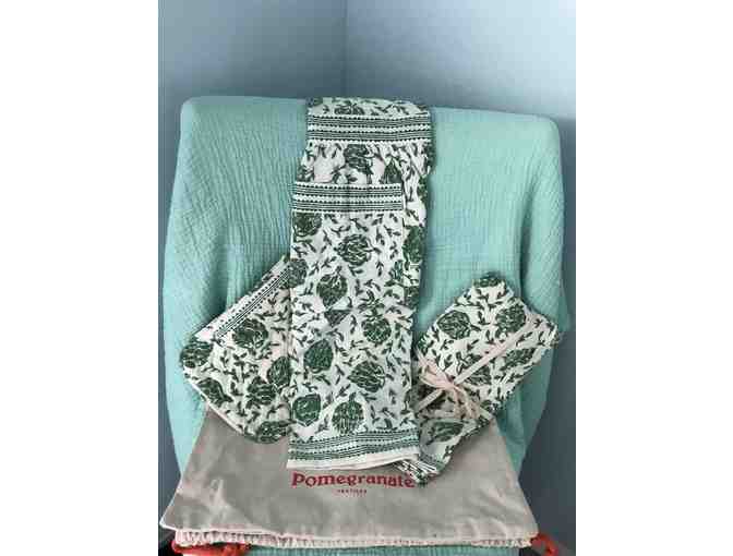 You are bidding on a lovely set of 100% cotton kitche items with "Dancing Artichokes". a tea towl, an oven glove and mitt set and an apron - all from Pomegranite.