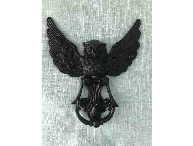 Door knocker measures 7 inches high by 5 1/2 inches wide. Includes screws for mounting.