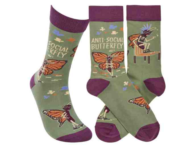 A pair of colorful woven socks from our LOL Made You Smile Collection displaying hand illustrated designs of cool butterflies with "Anti-Social Butterfly" sentiment. Socks feature a one size fits most design made with cotton, nylon, and spandex.