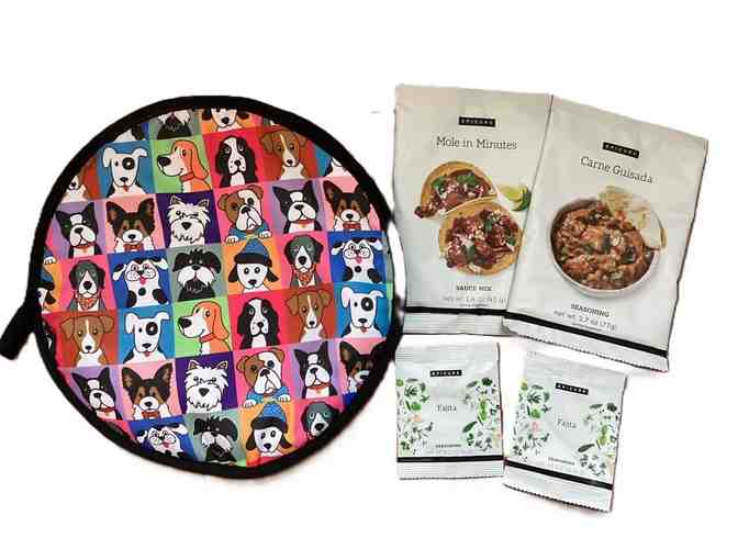 Keep tortillas warm and ready to serve with this insulated tortilla warmer, perfect for your animal-loving home! Simply warm your tortillas first, then stash them in the insulated warmer where they will keep warm and toasty until it is time to eat. Do not use in microwave. Machine washable. Includes two Epicure fajita seasoning packets; one package of Epicure Mole in Minutes sauce mix; one package of Epicure Carne Guisada beef seasoning mix. Seasonings are all gluten free