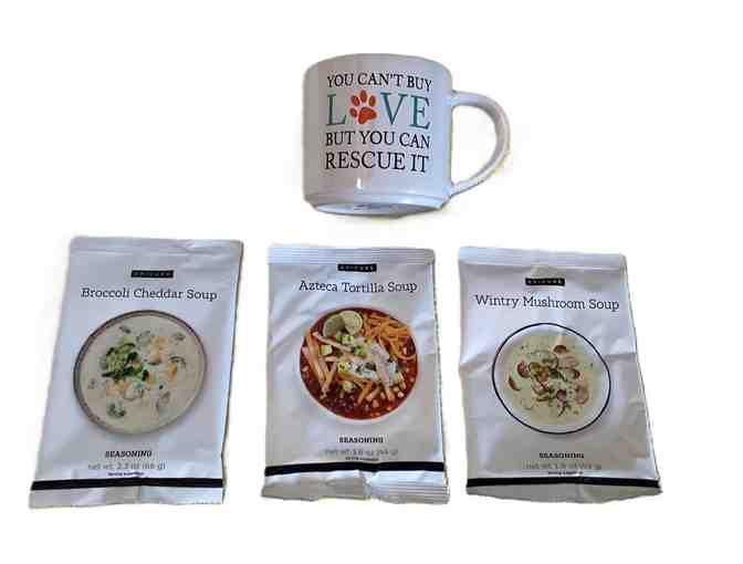 Large ceramic soup mug with three packages of Epicure gluten free soup seasoning mixes. Seasonings are for Azteca Tortilla, Broccoli Cheddar, and Wintry Mushroom soup.