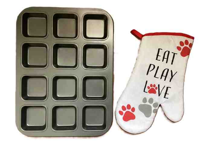 With 12 square baking reservoirs, this unique brownie bar pan lets you create a variety of yummy sweets and savory treats ... from square muffins to quiches, cornbread, cupcakes, coffee cakes and more! The baking pan has a non-stick surface that releases food easily. 10 ¼ inches long x 13 ¾ inches wide. Coated carbon steel; dishwasher safe. Includes a 12 inch long Eat, Play, Love oven mitt.