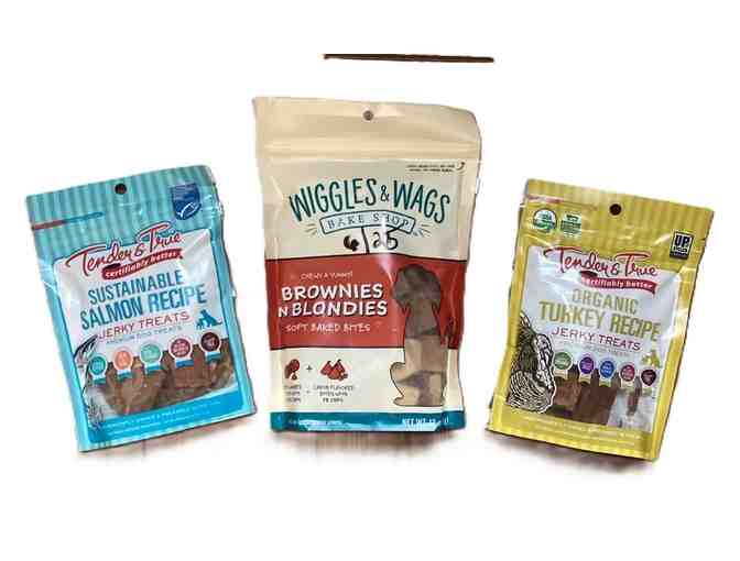 Two 4 ounce packages of Tender and True jerky treats. Includes one package of salmon recipe featuring certified sustainable wild-caught salmon as the first ingredient (expiration date 3/1/25) and one package of turkey (expiration date 6/19/25) featuring cage free organic turkey as the first ingredient. A single protein snack made in the USA that features a soft, tender texture that dogs love. Grain-free recipe contains no corn, wheat or soy. Large 12 ounce package of Brownies and Blondies soft baked bites by Wiggles and Wags Bake Shop. Made in the USA with no artificial colors, flavors or preservatives. Made with carob and peanut butter flavored chips with no added corn or soy. Expiration date 6/25/25.