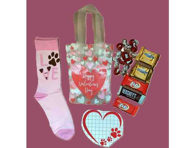 Great Valentine gift for a dog lover. Contains a variety of candy including Hershey kisses, Kit Kat bars and Ghiraradelli milk chocolate caramel squares; a pair of dog themed socks; a handcrafted 6 inch paw print vinyl sticker that can be placed on windows, water bottles, etc. Packaged in a cute bag for gifting.
